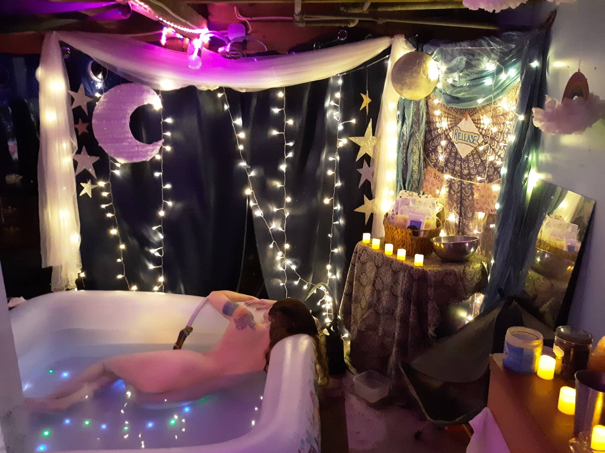 I usually like to listen to my Hypnobabies audio tracks with a headband but today I found the headband to be irritating and decided to just play my tracks on the speakers. I listened to my Birthing Day affirmations while I did last-minute preparations for my birthing space. I set up my poolside snack table and turned on all of the dim lights that I had planned out, including LED curtain lights and some orange flameless LED candle lights.