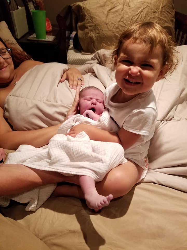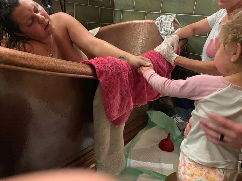 After a half hour we were filling up the tub and I was already starting to push. About 10 minutes later everyone arrived, dogs were in full barking mode and woke up my little doula in training (2.5-year-old) she was so sweet in holding my hand and rubbing it. She stayed quiet and observed she was