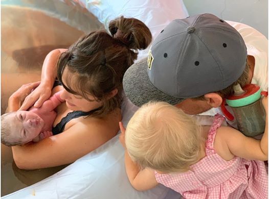 As soon as I got in that tub I had that “ahhh” moment that Barbara Harper talks about with waterbirth being nature’s epidural. It didn’t take away the discomfort completely, but it was GREATLY reduced. And I felt immediate relief, the warm water was amazing. My 18-month-old was sitting in the living room in her stroller from when he walked the dogs, he left her to call Sarah and I could hear him on the phone telling her he thinks I was pushing (and apparently she could hear me) he came in and told me Sarah would be here in ten minutes, that was a relief. I was still bearing down with each birthing wave. What seemed like not much longer, my doula arrived. I was so happy to hear that. She immediately started applying counter pressure to my back during a wave, and that helped greatly as well as putting the warm water on my back and using a cold wet ice rag on my neck (I was still listening to my Easy First Stage track) and told my husband he needed to put on the Pushing Baby Out track (Hypnobabies track just for pushing), out loud.