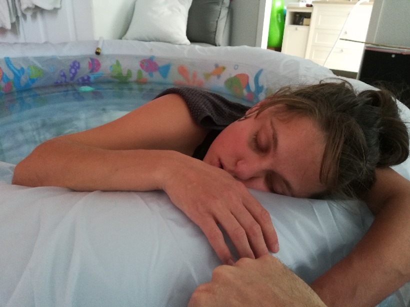 I kept thinking about the toast I had made, and how I should eat it for energy, but I was nauseous and shaking already, and couldn’t stomach it. I remember thinking “nausea and shaking are transformation (Hypnobabies word for transition) … there’s no way.” It’s funny because when Kerry would say every hour would feel like 20 minutes, I’d get frustrated and think “whatever, this is taking forever.” (It wasn’t LOL) As my husband was filling the pool, I ended up on my hands and knees during a pressure wave, feeling a bit out of control, saying loudly PEEEEEACE (Hypnobabies word for instant physical comfort). To try and direct my hypno-anesthesia. I kept thinking to myself, it doesn’t seem like this is working, there’s so much discomfort.