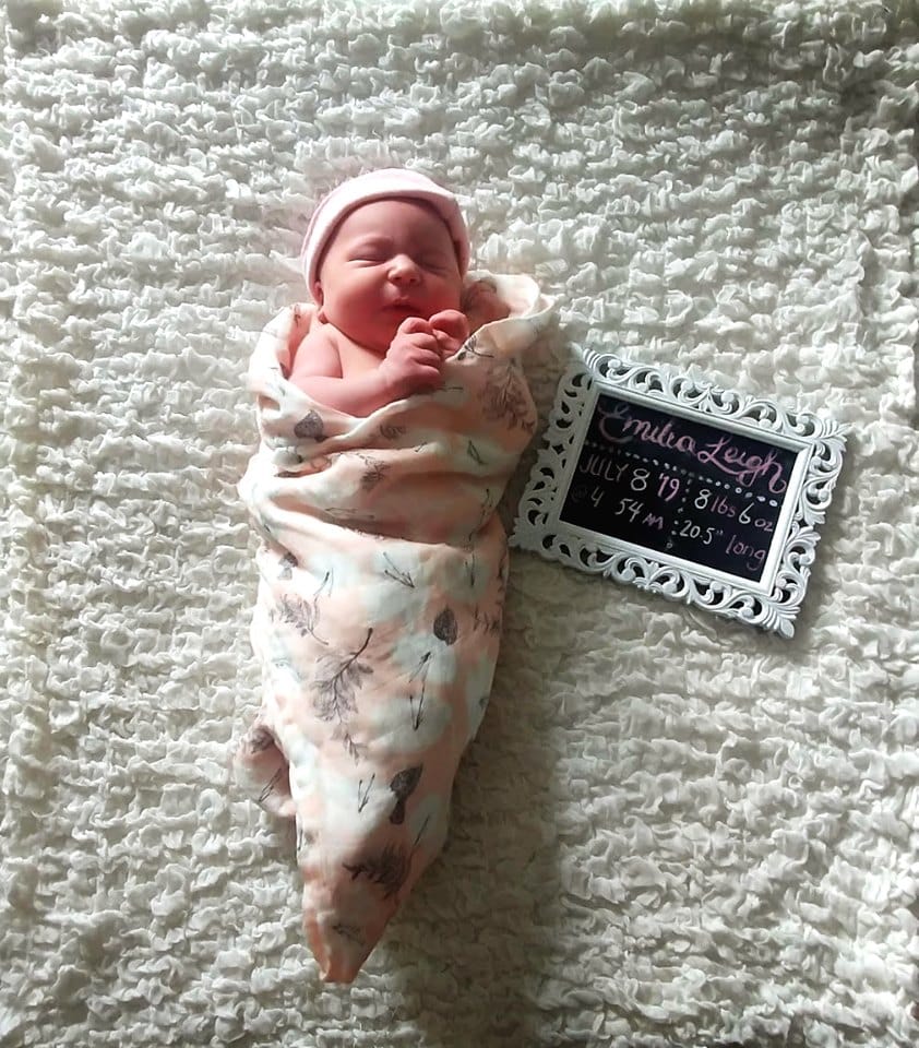 I’m not sure how long it took after that to fully dilate, but it wasn’t long. At some point our second midwife, Krista, arrived. When Sylvia said “ok you can start pushing now” I felt a huge wave of relief. Unfortunately, nobody remembered to put on Pushing Baby Out (Hypnobabies track just for pushing), but Easy First Stage (Hypnobabies main birthing day track) was still on which was helpful. I had about 2 or 3 big pushes for each pushing wave. I don’t know how long I pushed for, it honestly felt like forever and like seconds all at once. The baby started crowning, and that gave me the encouragement I needed. 2 more big pushes and her head was out! One more push and the rest of her came out. Emilia Leigh was born at 4:54 am, weighing 8 lbs 6 oz.