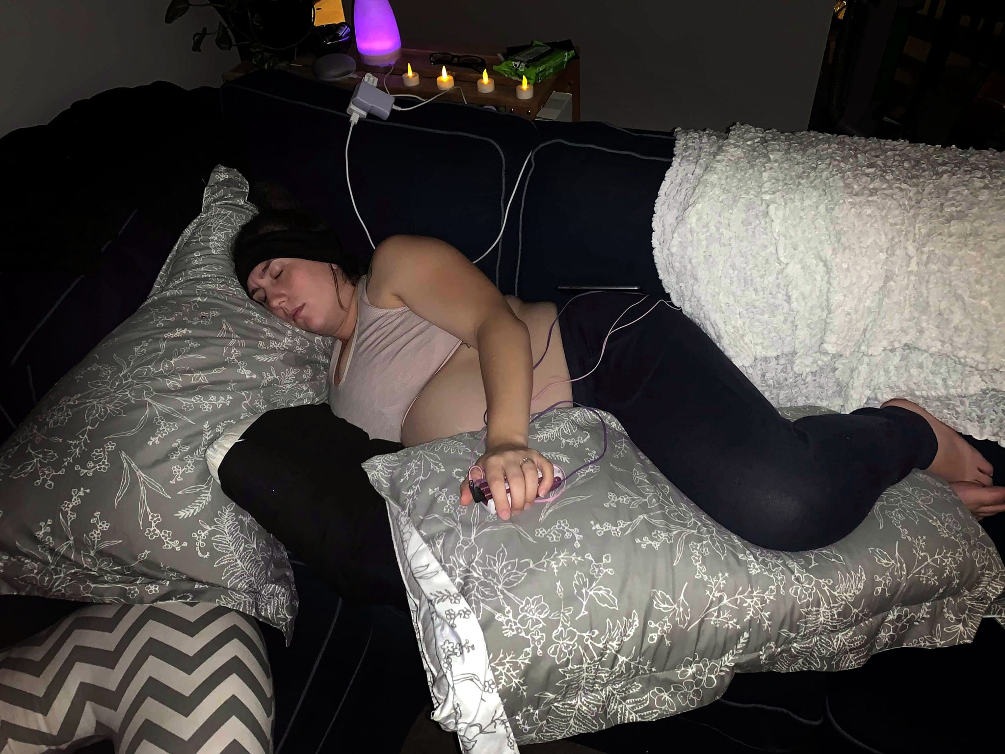 Then I went back to my bed to lay down and listened to Deepening (Hypnobabies track to deepen the level of hypnosis), then Affirmations again while I timed some more waves. At around 6 pm my waves were 7-8 minutes apart. I called my best friend, Jessica, who was going to be a part of my birthing time (Hypnobabies word for labor) and she came over around 8, while my husband was putting our 3-year-old to bed. I laid down on the couch and listened to Deepening again while I used my switch and rode through my waves.