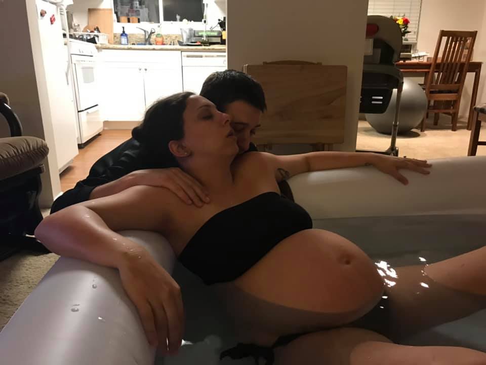 “Carrie arrived at 9:04 pm and came in and sat with me while I was in the pool. She turned on the hypnosis track Easy First Stage (Hypnobabies main birthing time track), was coaching me through my pressure waves (Hypnobabies word for contractions) and showering me with beautiful affirmations to keep me calm and confident.”