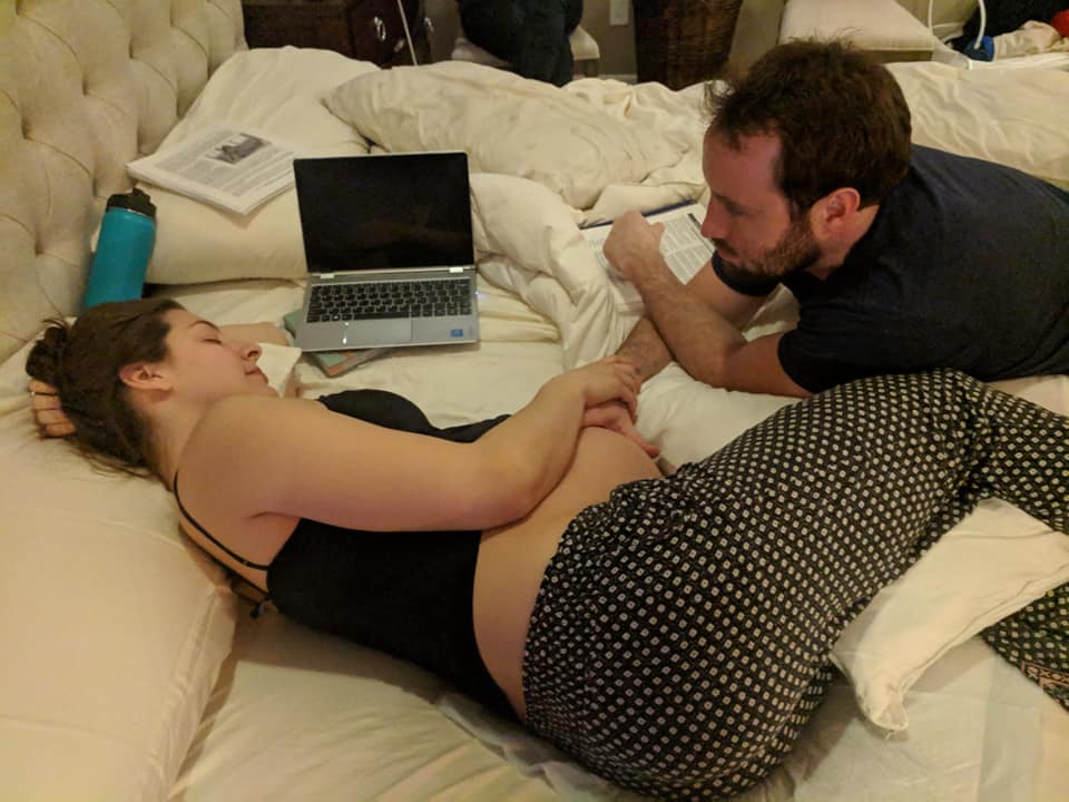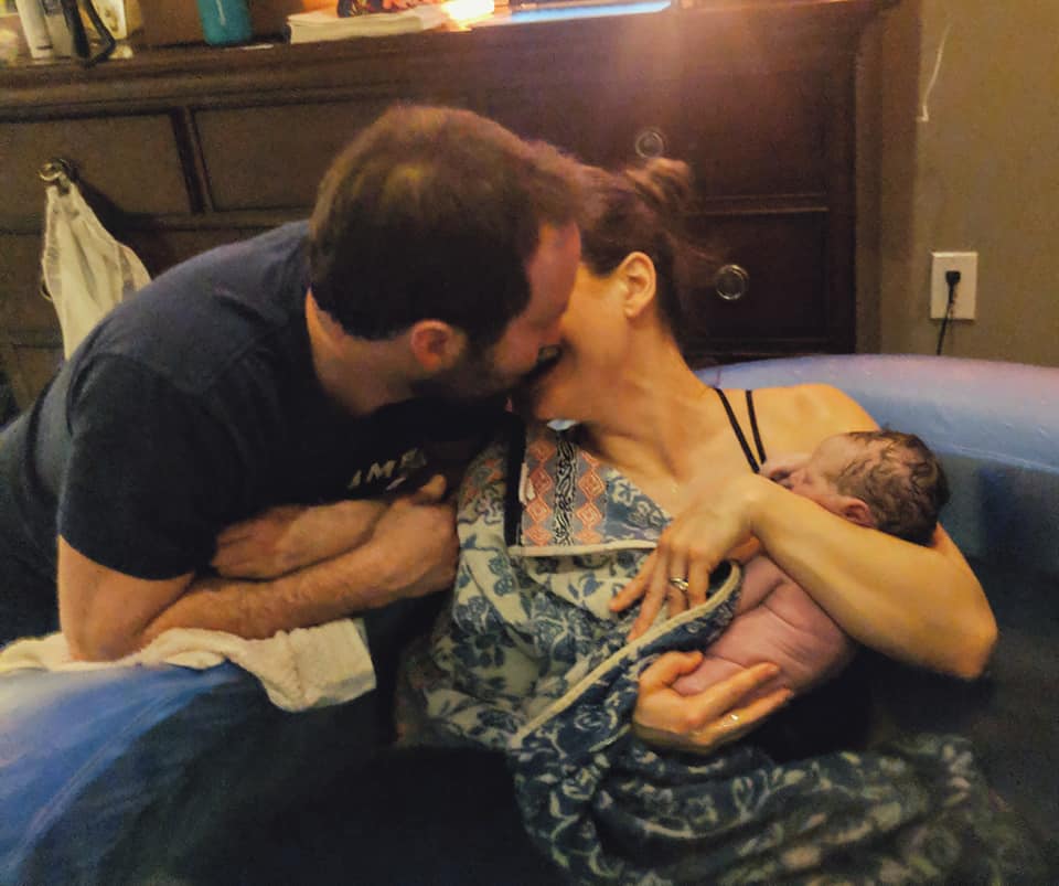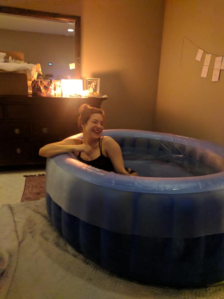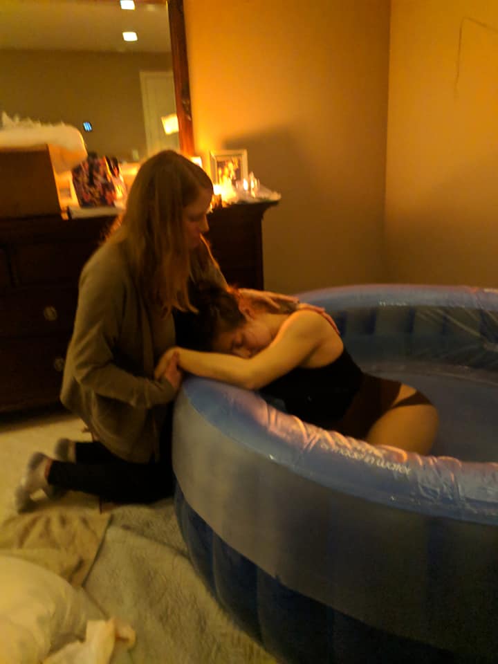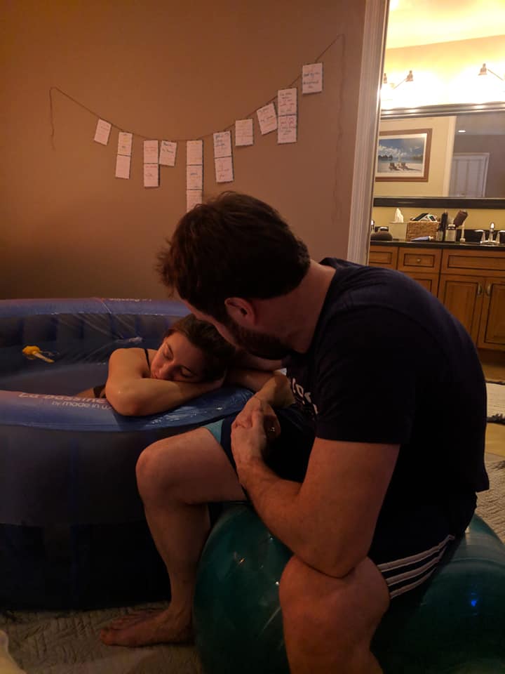 My husband and midwife rushed to get the birth tub filled up and her assistant and my doula rushed over and arrived by 8:30. I had a hard time focusing on my Hypnobabies tracks because of all the excitement and I felt like I was managing my waves pretty well. I think I was in denial it was all happening! The 5 of us were laughing and joking around in between my waves and had a picnic on my bed. It was a fun time!