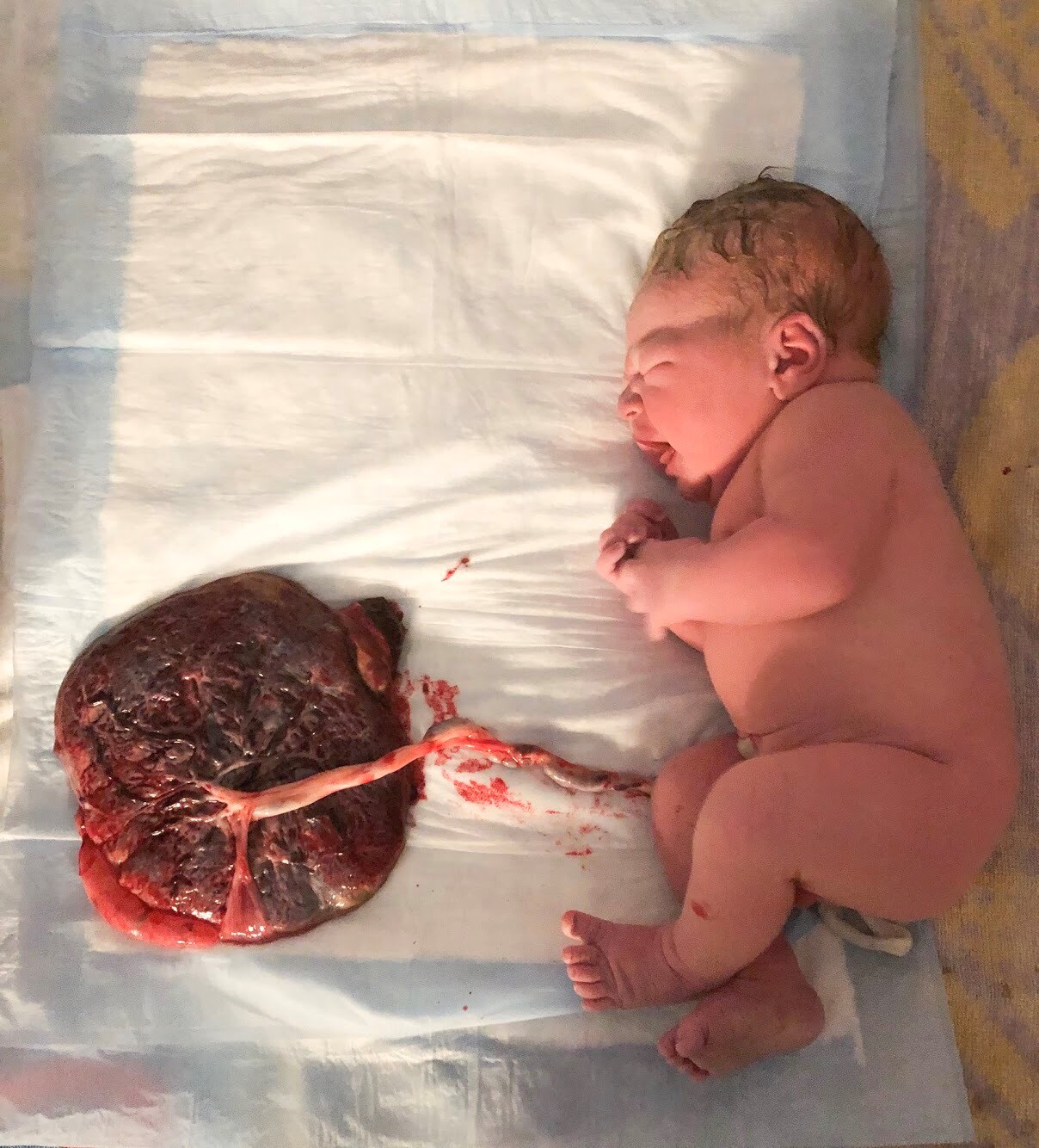 At this point the midwives were arriving. I’m told it looked like I had no waves for a long period, but I know I had three waves. I had flipped to the Pushing Baby Out track (Hypnobabies special hypnosis track for comfortable pushing) (spoiler alert – it is the BEST track of the entire program) and once again Kerry (voice on the tracks) said something that settled me down (this happened in my previous Hypnobabies birth as well although I don’t recall what it was this time). I rode three strong waves without a soul knowing it (because they told me they didn’t think I had any after the fact!). Then things got real. Two very strong waves came, pushing my water sack out. This happened in my last birth too. I could feel my pelvis shifting with the waves, but it wasn’t painful. It was pressure. So much pressure. On the next wave the head descended, hard, fast and out all at once. In four births, I never felt my body push that hard. It was all my body. And I was loud! And baby was en caul (born in the amniotic sac)! I felt the body turn and after a 2-minute pause, my body pushed the body out, slowly and gently, en caul until the waist. I caught him with my own two hands and brought him to my chest.