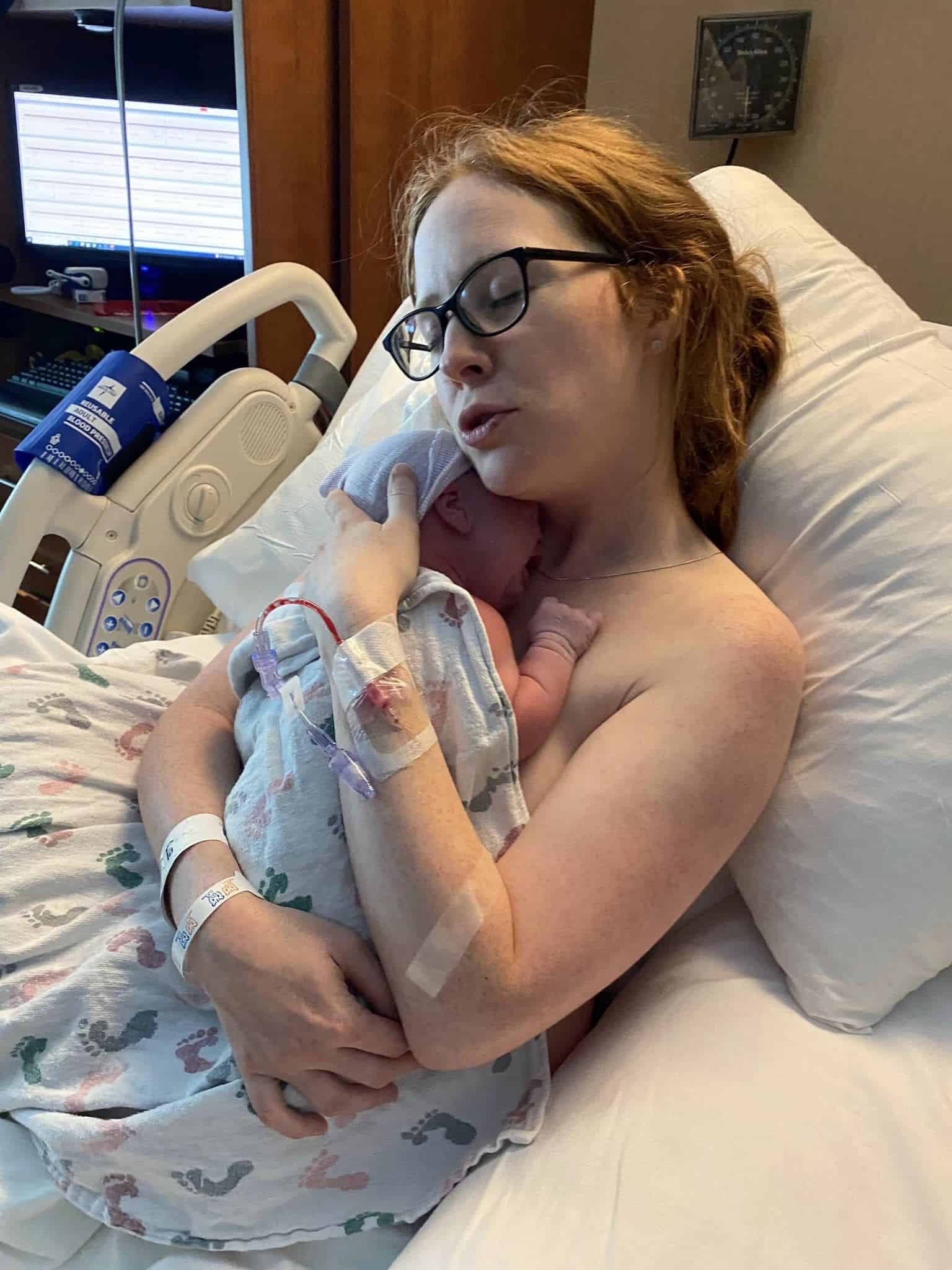 They started the Pitocin at 9:30 AM and I laid in bed for hours doing hypnosis. Nothing was happening so the nurse wondered if I was so relaxed doing Hypnobabies that birthing waves weren’t starting. I decided to walk around and listen to my hypnosis around 12:30 pm. I instantly started having waves (Hypnobabies term for contractions) and they were quickly progressing. I couldn’t believe how strong the waves were becoming so fast, as with my first it was a 21-hour process. The nurses and my midwife didn’t realize how far along I was, as I had just been peacefully laying in my bed and was also able to talk calmly between birthing waves (thanks to Hypnobabies). But I knew I was in transformation (Hypnobabies term for transition), so I told my husband to get my midwife. I asked the nurse to blow up the pool, but she wasn’t sure it was time. I was checked and was 8 cm! I didn’t think they were going to get the pool blown up quick enough. They stopped the Pitocin and I got into the pool. My baby girl was born at 2:55, in the pool-less than 2.5 hours after my first birthing wave!!