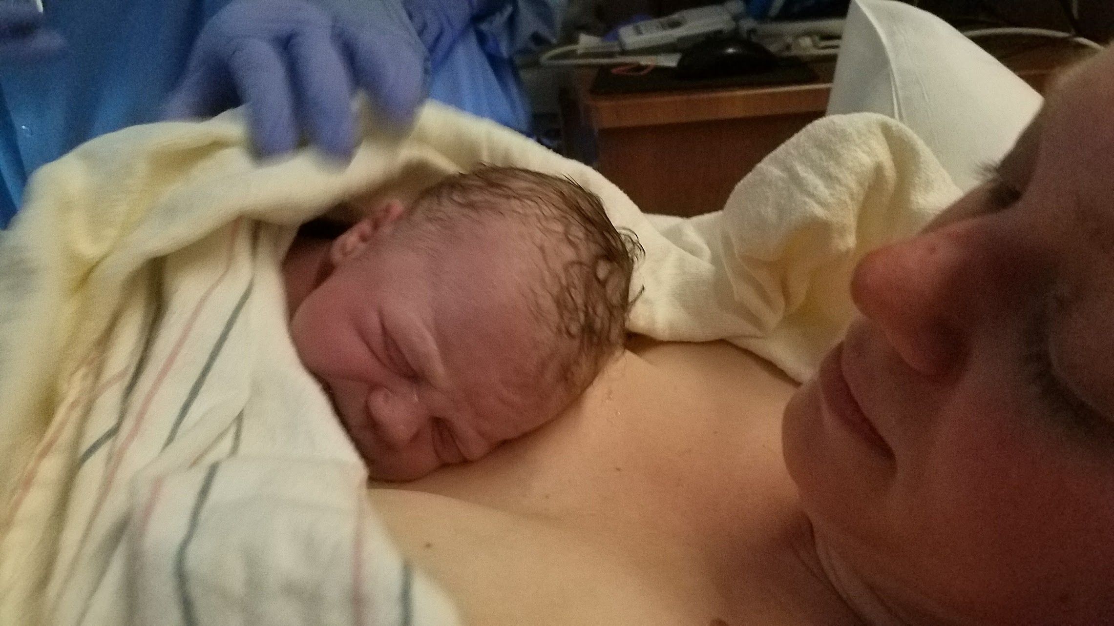 After a race to the hospital, a quick check and confirmation that yes, I was 9 and 3/4 dilated upon arrival, we were taken to our birthing room and it was time to fill up the tub (which unfortunately had an issue with the water connection, but fortunately still was full enough in time). It was a beautiful birth experience. I was able to get in the tub (even though I was GBS+), knelt forward and let my baby descend the way he needed to.