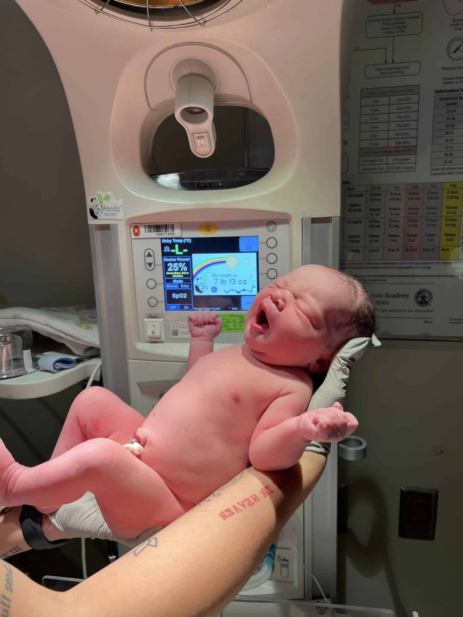 I’m not sure which came first but I think it was the quick ultrasound, in which doc said baby was low. Then I think she did a cervical check and said it was at +2. Baby’s heart rate dropped below 100bpm after my water broke and wasn’t coming back up so someone told me they needed my best, strongest pushes. I began pushing without a wave while on all 4s on the bed. The nurses were very helpful with asking what position I wanted and suggested side lying. I wanted to try knees so I could better watch baby be born but I could feel my hemorrhoids taking extra pressure and it felt like my body was working very hard on my knees, so I went to my left side and asked someone to fully hold up my right leg. I used my next wave to begin strongly pushing through my bottom. It was much easier on my side, and it took only one or two pushes to get baby out. I felt the baby crown then its head was born. Normally, my babies slide right out after that but I heard nurses saying to keep pushing and then I felt the doc strongly help baby’s shoulder out. The cord was double wrapped around baby’s torso and doc/nurses worked to get it free. I told them NOT to announce gender and was able to see for myself very soon that baby was a GIRL!! Baby was very healthy and doing well. I was able to cut her cord, although they clamped it before it was fully white. Then baby remained on my chest until my placenta was easily birthed several minutes later. Baby’s head was born at 11:59pm but with the extra time of birthing her shoulder, her official birthday carried over to 12:00 am on 10/5/2023!