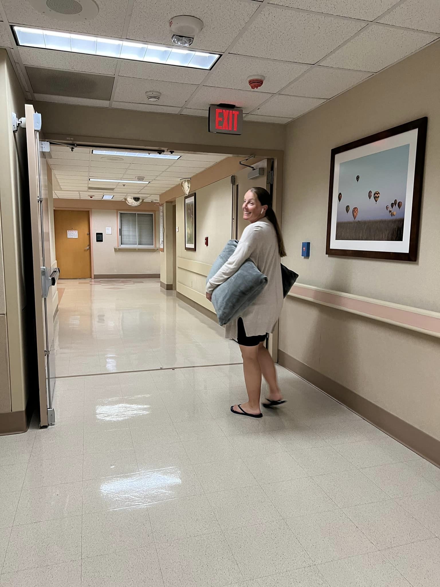 We left the house at 10:48pm. I sat in the passenger seat with my body pillow listening to Easy First Stage and was able to chat normally with my husband between waves. We arrived at the hospital at 11:15 and worked our way up to L&D (with stops for waves every 3 minutes and a bathroom break). I could no longer sit during waves, so I stopped and leaned into my pillow wherever I was. I leaned over a chair at L&D check in and had two long waves while waiting to get pulled back to triage. On one of the waves, I had the very beginning noise of pushing. I was walked back to a birthing room and able to bypass triage (one of my pictures is me leaning into my pillow against a wall to relax through a wave on the walk back) but my husband wasn’t allowed to come with me at first while they asked me intake questions (including a DV screening).