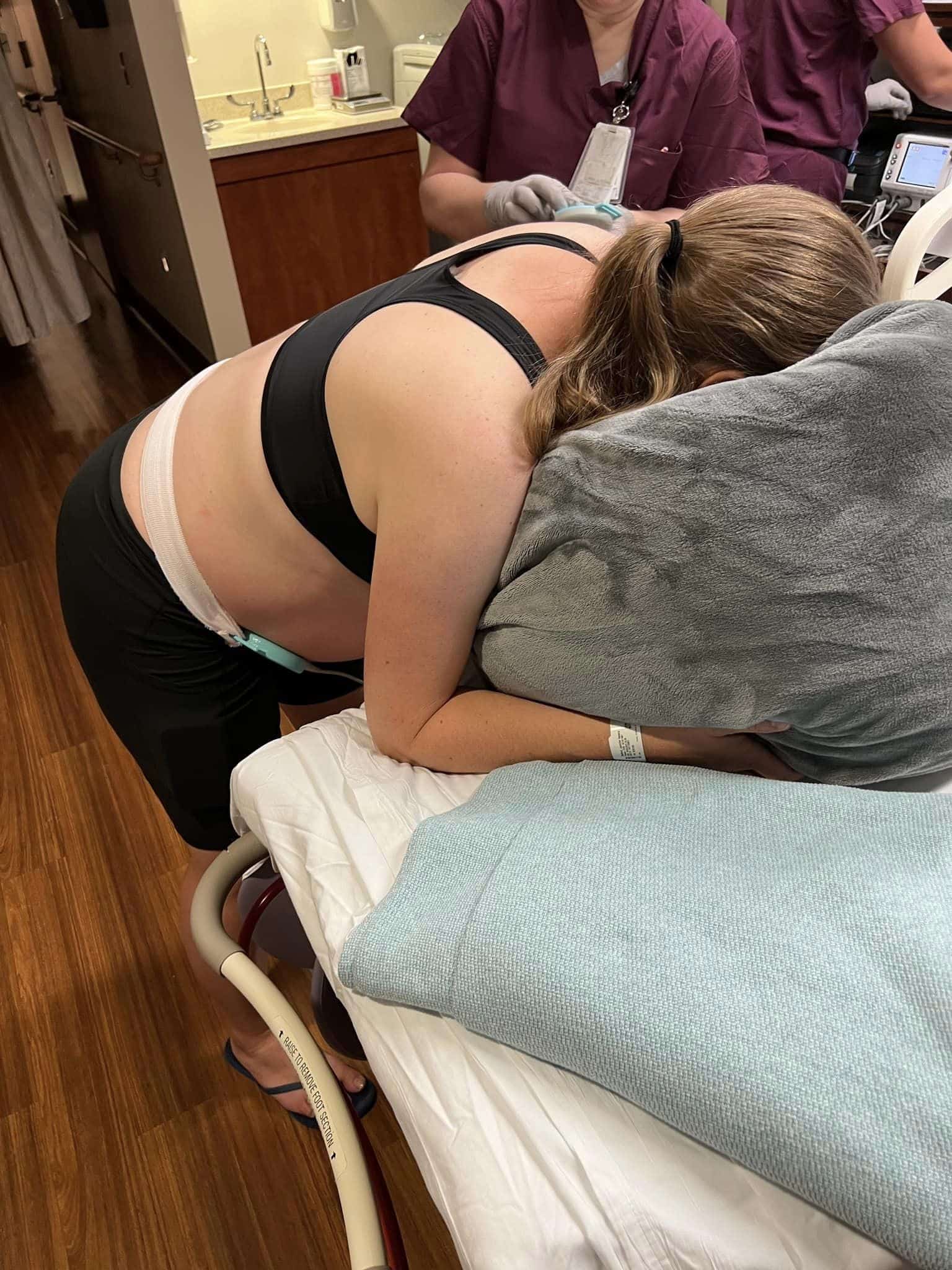 The room quickly filled with people trying to do all the things to bring baby safely here. One nurse was holding a Doppler, one was mopping the floor, the doc was trying to get me on the bed for a check and ultrasound to confirm head down, one nurse was giving me an IV port, and there were more I wasn’t aware of. One nurse helped me on the bed and helped take my shorts off. They kept asking what position I wanted to be in. I wasn’t sure so I just stayed on all fours. I heard someone say they needed to make sure I wasn’t pushing against my cervix before it was ready and the doc tried checking me just as a wave started but I was able to vocalize for her to stop.