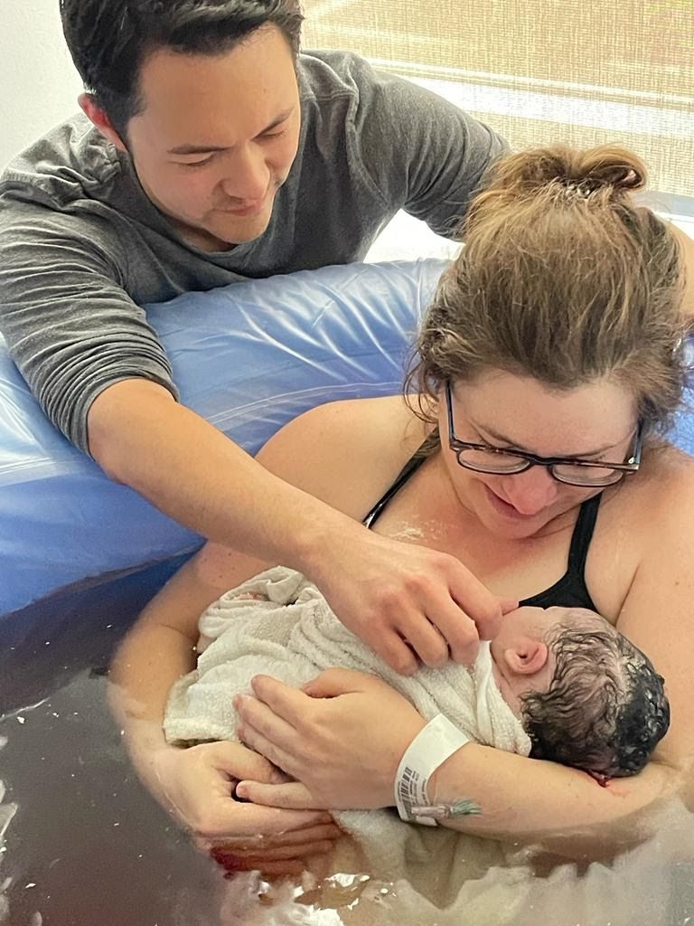 After a 4 am phone call to our neighbor to come look after our daughter, we left for the hospital. From this point onward I had an earbud in and was playing various hypnosis tracks for the entire remainder of my birthing time (Hypnobabies term for labor). Upon arrival at the hospital, I was found to be 5 cm dilated, so was admitted and immediately sat backwards on the toilet while my team started setting up the birth pool. After about 2 hours I was ready to get into the pool. I vomited again, after which I accepted some anti-nausea medication and a partial IV bag to rehydrate. After about 2.5 hours in various positions in the pool they checked me again and I was at 9 cm. I agreed that they should break my waters to keep things moving along and had about 30 minutes of transformation (Hypnobabies term for transition) and then 30 minutes of pushing before my beautiful daughter Elyse was born into the water. I caught her and lifted her to my chest and we got to cuddle her in the water for about 45 minutes before getting out and drying off. She was 8 lb 3 oz, with a full head of dark hair.