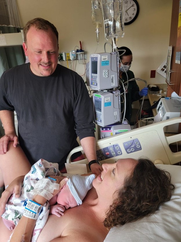 Around 1:30pm I laid down to rest with the Deepening track (Hypnobabies track to deepen the level of hypnosis). After 30 mins I felt my baby suddenly drop lower onto my cervix and immediately the waves were much more intense. I knew it was time to settle deep into hypnosis and have this baby. I turned on the Easier First Stage track (Hypnobabies main birthing time track) on my earbuds and found a position where I could completely turn off between waves (sitting on a chair with my head resting on my husband’s stomach). He gave me the Relax cue (Hypnobabies cue to deepen the level of hypnosis) over and over during each wave, and that was crucial for me. I had to really focus on not tensing up, and I did vocalize with low sounds to get through each wave.
