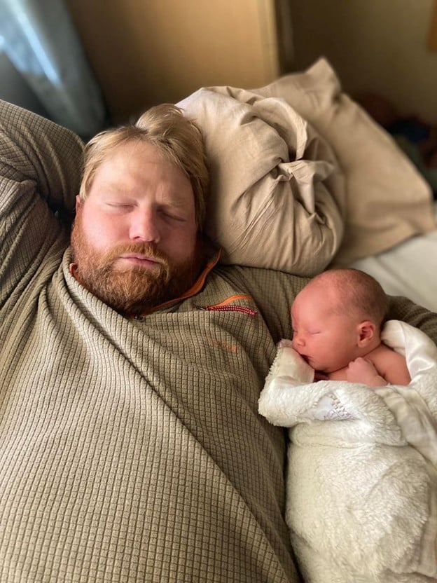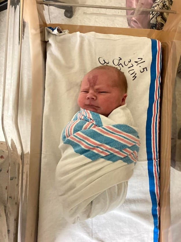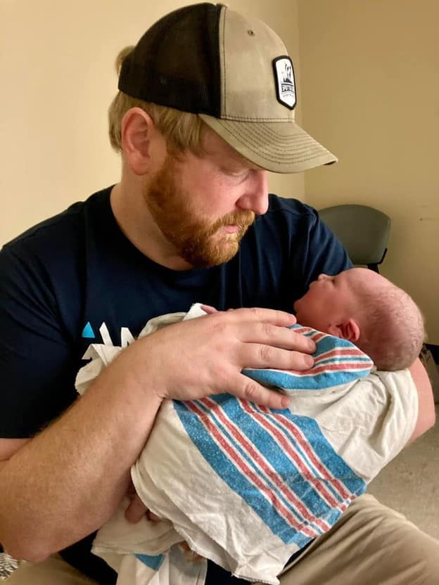 In triage, I immediately went into the SHARED () bathroom and got on hands and knees. The nurse tried to talk me out of it, but I knew it was best for me. After about 3 waves I went back into my triage room and agreed to a check and was found to be 7.5 cm, which meant I was super close to my baby. Waves were about 1-2 minutes apart, still only in my lower belly like cramps, and I started planning how to push baby out. I realized the bed wasn’t big enough to get on hands and knees so when the midwife offered to throw a pile of blankets on the floor I quickly agreed. Once I’m on the floor I started feeling pushy immediately and just went with it. I blocked out that I was only 7.5 cm and focused on whether I was feeling pressure, which I was, so I let that guide me. I began pushing and after about 10 minutes of pushing our baby boy was born at 11:33 p.m.! Deepening was still playing as I took my headphones off . At 8’12 he is my smallest baby by a whole pound and the pushing took hard work but once I got his head into the birth canal the rest of him easily followed.