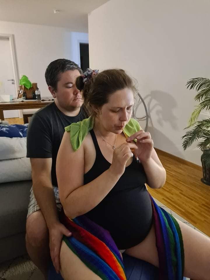 The waves were so strong and without pause that I couldn’t take the time to explain the program. Due to Covid, my German Hypno-Doula was not allowed in the room, and my husband was right in it with me during each powerful, back to back wave that he also couldn’t really explain things to her.