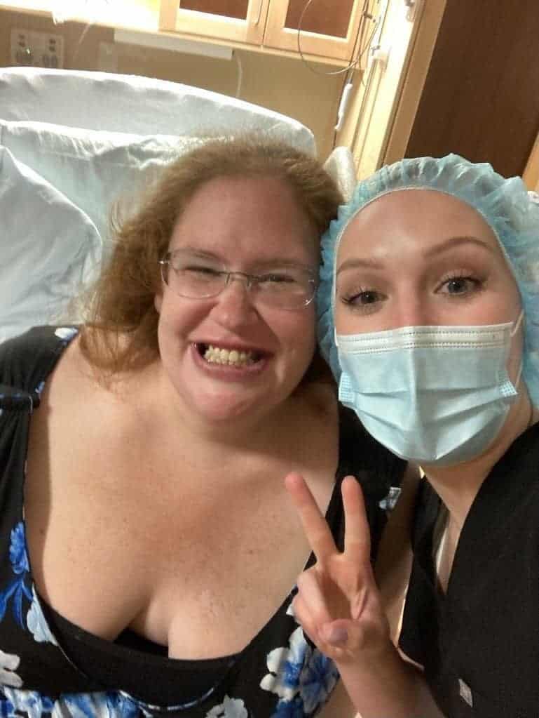 The Peace cue helped me relax and calm down but didn’t stop the shaking. Becca went to go help the anesthesiologist and I quickly said, “No. I need you to stay here and be my support person since Anthony can’t be here right now.” She replied that that was fine and that she was there for me. She had me hold on to her arms as I tried my best to stay still.