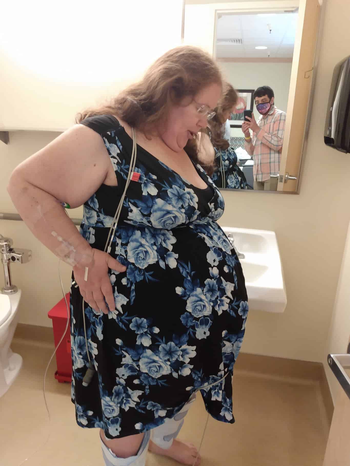 He then opened the door and let the nurses know we were ready to proceed. A nurse came in and shaved me in preparation for the surgery. Then my midwife came in to check that I was ready. She had the nurse shave a little lower and then said I was ready. We took a quick selfie together to commemorate making it to our 34-week goal. While this was happening, another nurse came in with surgical wear for my husband. She told him that she would be back in a few moments to help him get gowned up. Then that nurse, a student nurse, Becca and Dr Meredith wheeled my bed out of the room, down the hall and into the maternity OR.