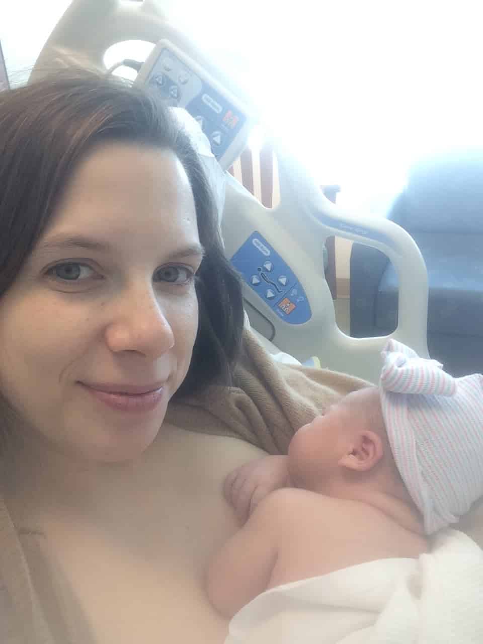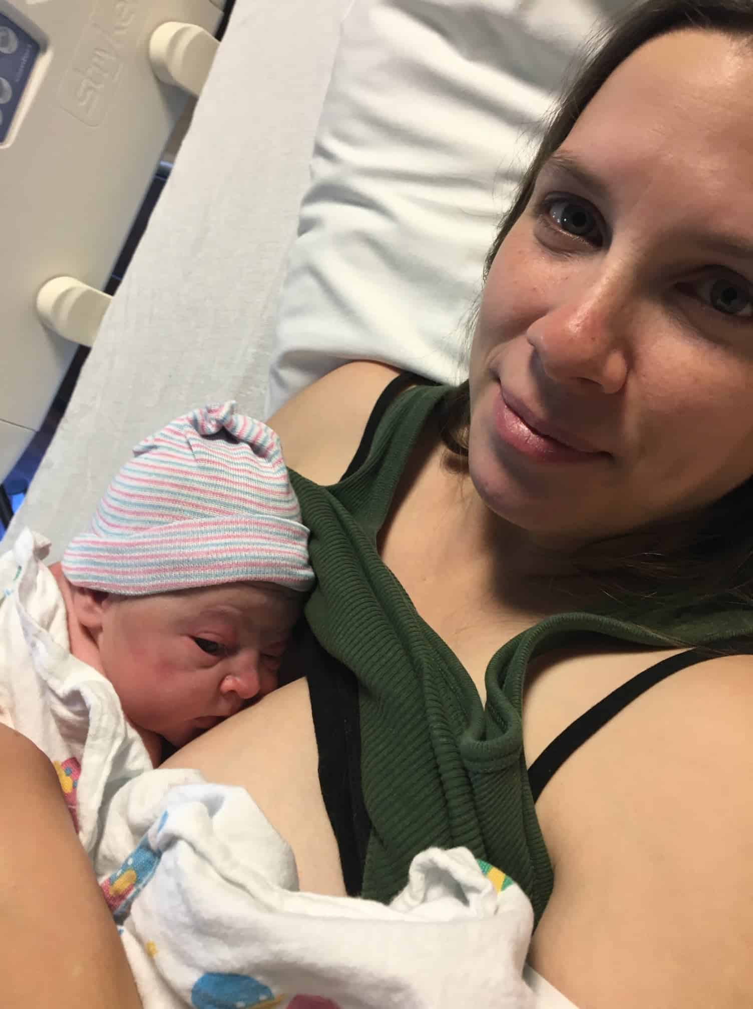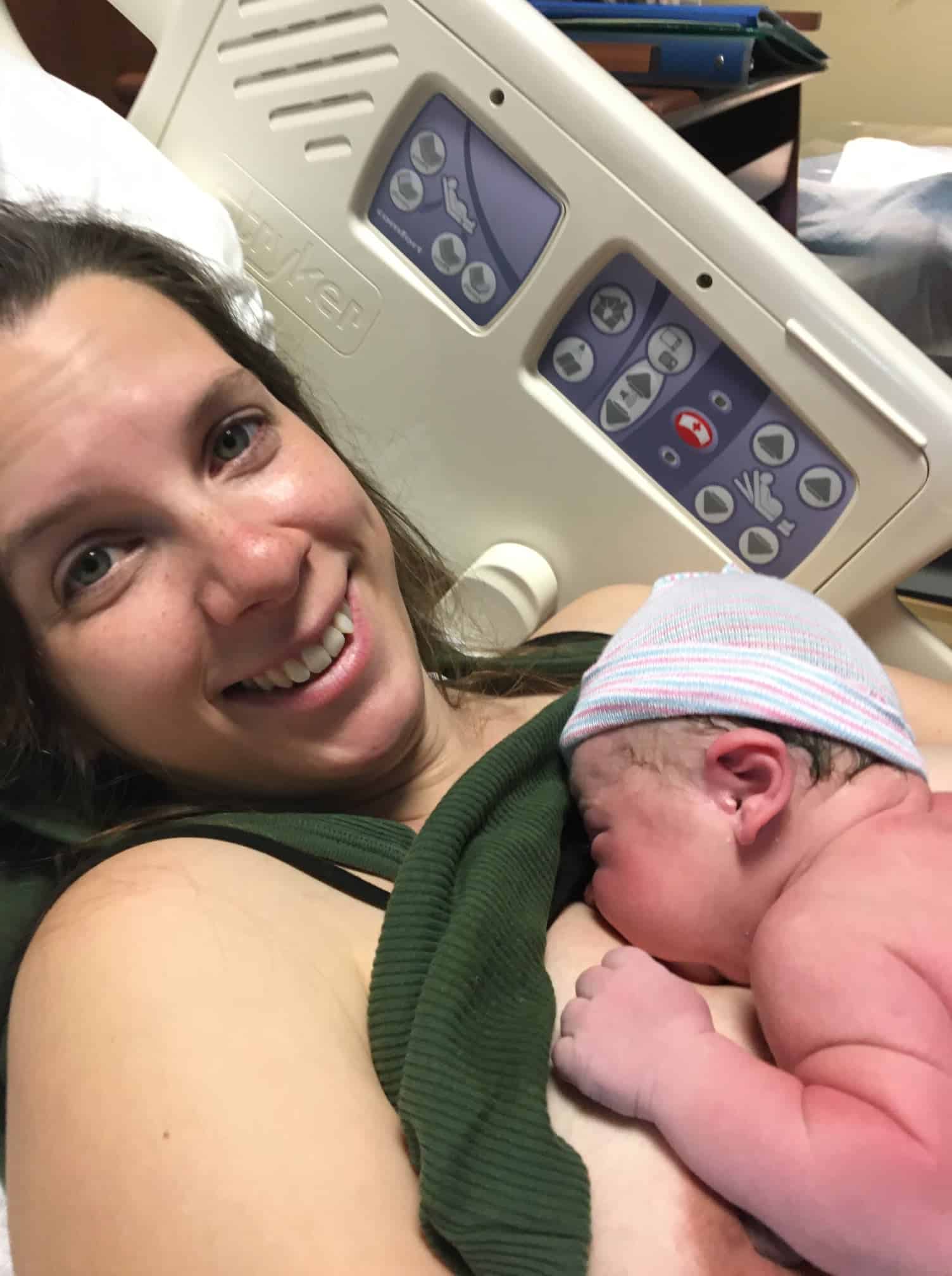 They didn’t have a birthing room ready, so they took me to a triage room. Things started to feel chaotic at this time and I felt like I lost control. The baby was coming, and I couldn’t get my bearings. My husband and a nurse quickly took off my shoes and leggings (very tricky to do since I couldn’t sit down!) and as soon as I got on the bed my body began to push the baby out. I was not intentionally pushing – it was the fetal ejection reflex. There were about 5 or 6 nurses in the room from what I could tell, and my husband quickly came to my side to help coach me through pushing. He reminded me to breathe, which I was able to do despite the chaos of the moment. I also used my voice a lot to cope with the pushing waves.