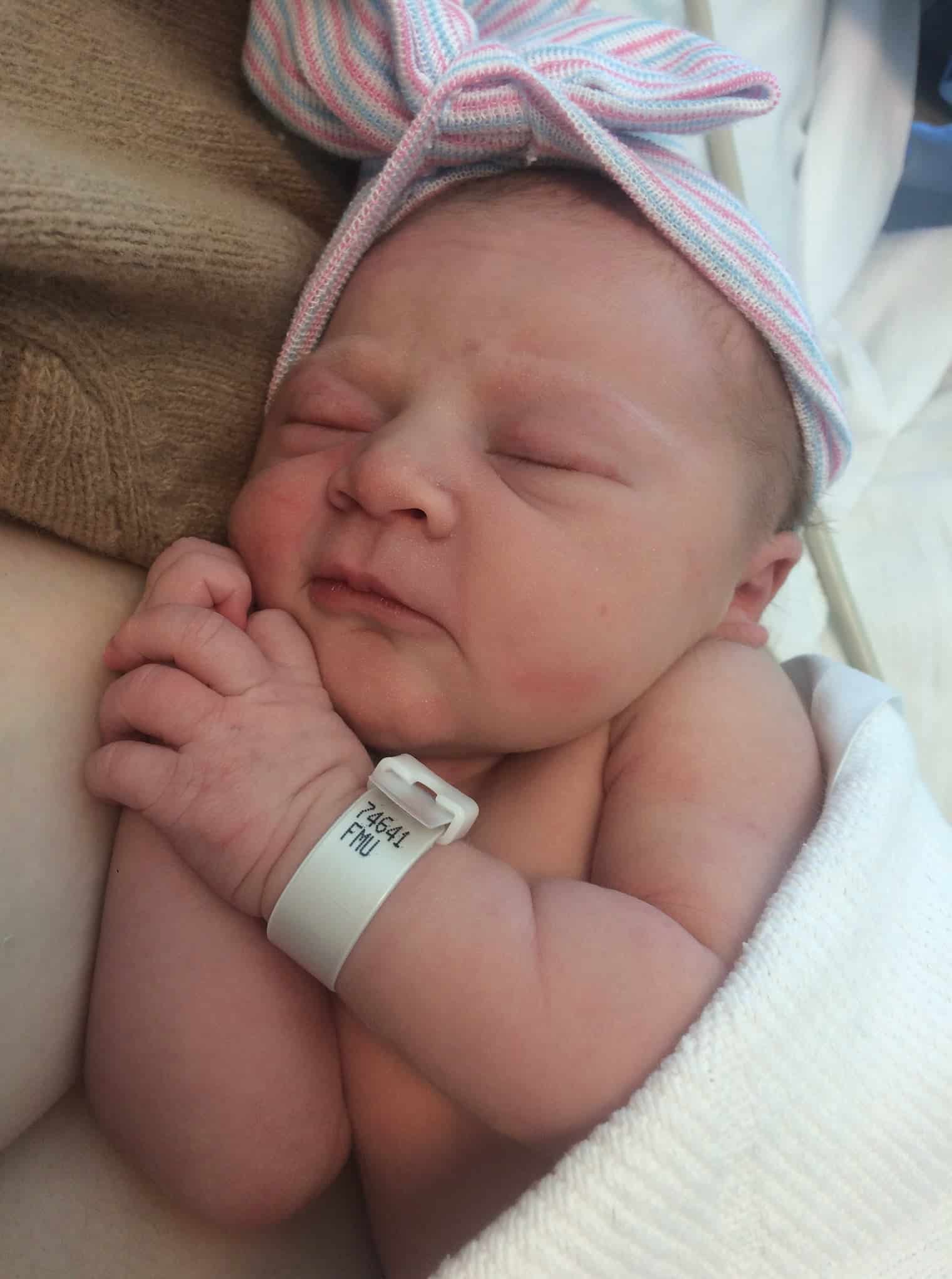 After just 3 or so pushes, baby was out! I looked up and my midwife handed her to me – she had JUST made it in time but didn’t have time to put gloves on before catching the baby. Only my husband knew we didn’t know the baby’s sex, so he checked and told me we had a baby girl! I was in shock from having birthed the baby so quickly, and my husband and I were both crying. She was born at 9:11 AM (just 3 hours after my cramping woke me up).