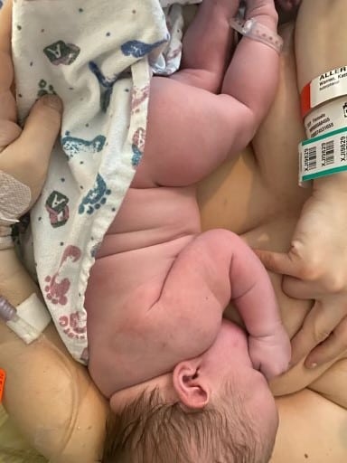 I asked my husband to turn on ‘Pushing Baby Out’ (Hypnobabies track just for pushing) track and stood up at this point. I felt I needed gravity to help some. I waited in between waves and let my body push. Baby slowly moved head, eyebrows, eyes, nose, then chin out, my body was allowed to slowly accommodate and stretch. The midwife was holding a warm cloth to my perineum. I could feel baby wiggling down. Then was able to have the body slip out! Baby immediately started crying and I was able to check the gender!! It was a Girl! Birthed the placenta when it was ready and able to wait for cord to be white to cut (so baby would get all its own blood!). She was 10 pounds 6 ounces and 21 3/4 inches long! Apgar was 9/9! Total birth time when I hit more of the active phase was 2 1/2 hours with only 30 minutes of pushing. Only medication needed was the little bit of Pitocin and there was no tearing:). Thank you Hypnobabies!!!