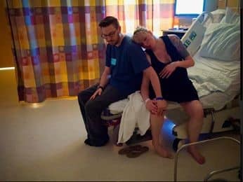 Something changed at that point, I have no idea what time it was, but I was just so exhausted I felt myself breaking down and wanting to cry after each wave. I remember thinking about the Hypnobabies affirmation “As each pressure wave ends, I smile and feel very happy” and feeling like I was doing something wrong because I wasn’t happy. I was tired, and I was uncomfortable, and I just wanted to press pause and take a twenty-minute nap. I put all my energy and focus on trying to stay as physically relaxed as I could through the waves. It was around this time that the nurses came in to set up the room for birthing. I broke down at one point, feeling so disappointed saying “They think I’m further along than I am, I’m not that far. I still have so much to go”. Something about them setting things up just made me feel so inadequate, like I wasn’t doing enough to get my baby out.