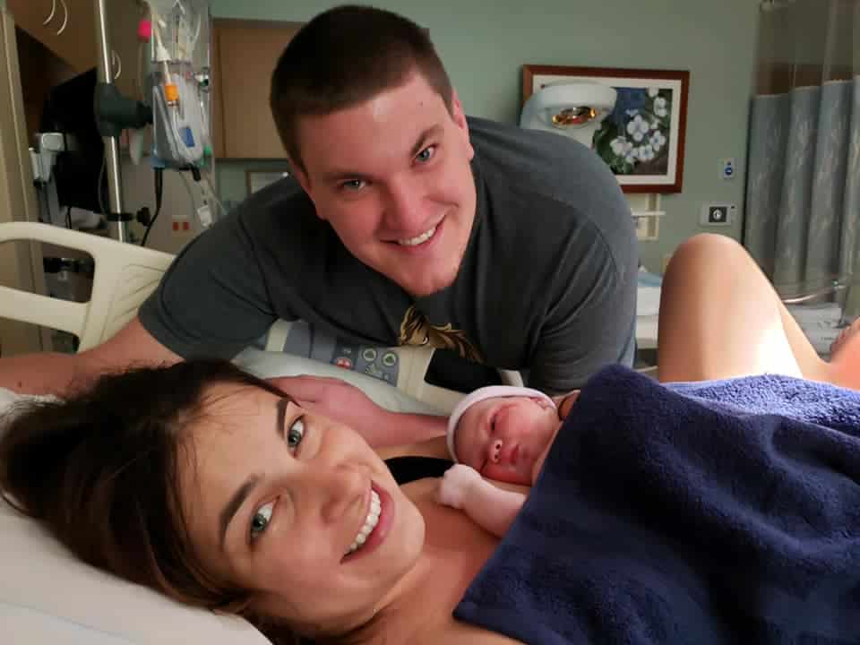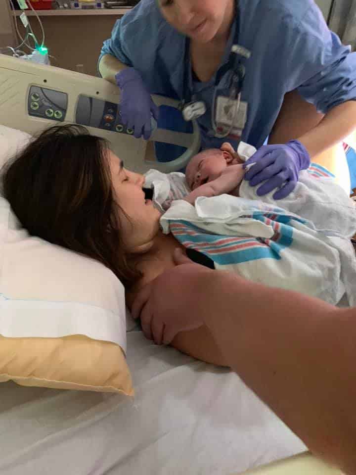 Finally, at about 2:30 pm, my midwife came in and said the words I had wanted to hear “We are going to have a vaginal birth”. I started to really push at that point and made progress quite quickly. We played the hypnosis music out loud in the room, but I did not feel the Pushing Baby Out track was appropriate for the pushing method I had chosen. The moment where I was able to reach down and feel the top of baby’s head gave me a huge rush of energy and I knew I was going to be able to do it. After about 45 minutes of active pushing, my beautiful Hypno-baby entered the world at 4:04 pm on 10-2-19. My husband announced that it was a girl and she was immediately placed on my stomach. It was truly the best moment of my life and 100% worth all 46 hours that it took to get her here. After my husband cut the cord and I pushed out the placenta, we were able to get her to latch on to breastfeed for about 45 minutes and really enjoy the golden hour with our beautiful baby.