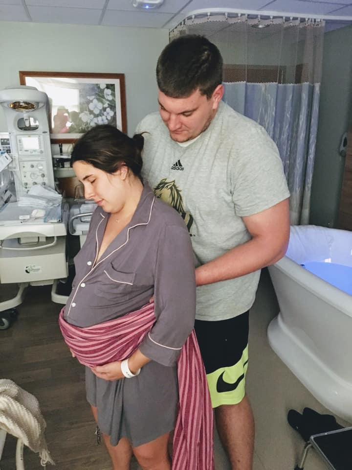 I allowed the nurse to check my cervix upon check-in but asked her not to tell me the number. Shortly after that my mom and doula arrived as well. I got into the birthing tub in our room through some pressure waves but ultimately found that I was not able to turn off and relax through pressure waves the way I wanted to. As the morning continued to progress, I continued listening to Easy First stage in various positions keeping my switch either in center (Eyes open hypnosis) or off (fully supported hypnosis) depending on the position. The waves were gradually getting more intense but were still manageable with my hypnosis. I was finding that their primary intensity was located in my back which was uncomfortable at times.
