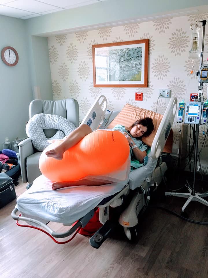 My midwife came in mid-morning to check on me and asked if she could check my dilation. Although I hadn’t wanted to know the number earlier, I trusted my midwife to tell me. Unfortunately, I was only at 2 cm. I was very disappointed to hear that number as I had felt that I was progressing and that baby was much closer to coming than that. I had even felt sick during some waves so I thought I was close to transformation (Hypnobabies word for transition). Because my water had ruptured, we discussed that we did need to start seeing progress but that she knew I wanted to avoid medical intervention. We agreed that I could try some positioning and the abdominal lift and tuck with my husband to try to get things going and recheck later. We worked on positions throughout the morning but when the nurse checked me again, I still had not progressed.