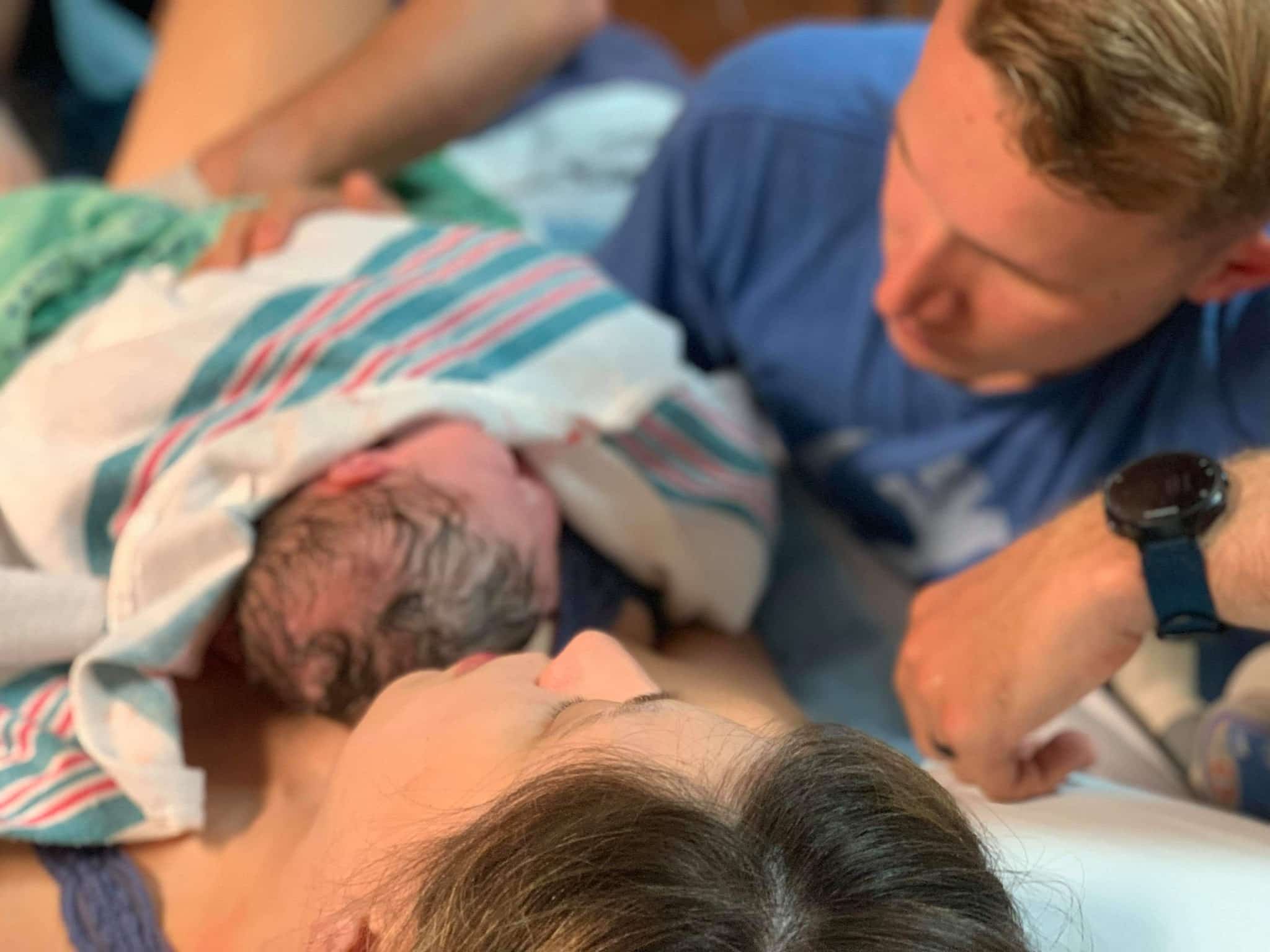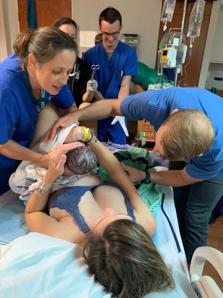 I was vocalizing in a way that almost scared myself, but I had no control over it. My husband told me later that he didn’t believe me, but he reached down to check and he felt the baby’s entire head already out of my body! My husband yelled that the baby was coming and as he started catching the baby, the room filled up with the birthing team. The midwife ran up to help him get the baby with her bare hands, it happened so fast. The baby was out in two big pushes. It was over in a matter of seconds.
