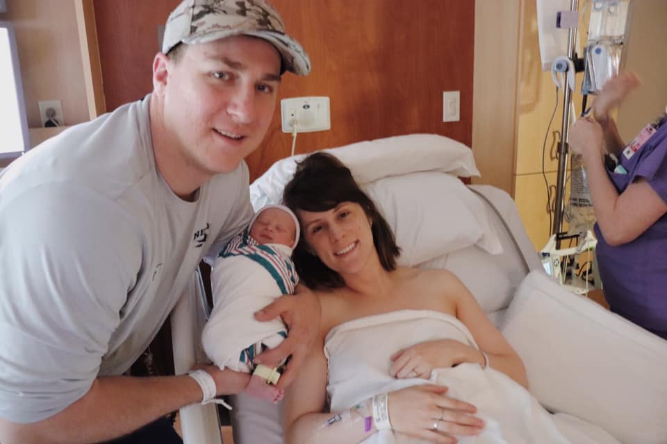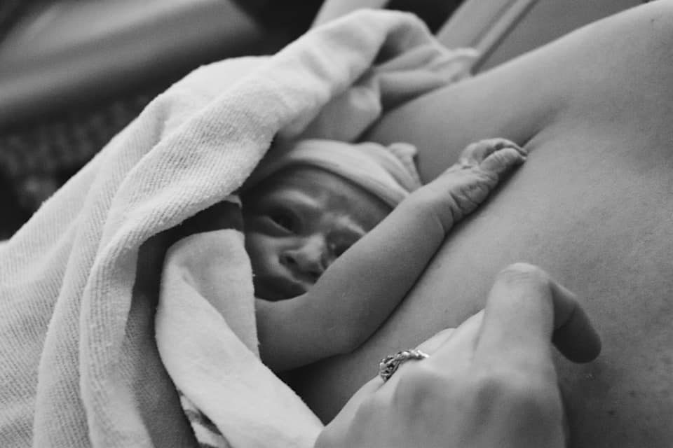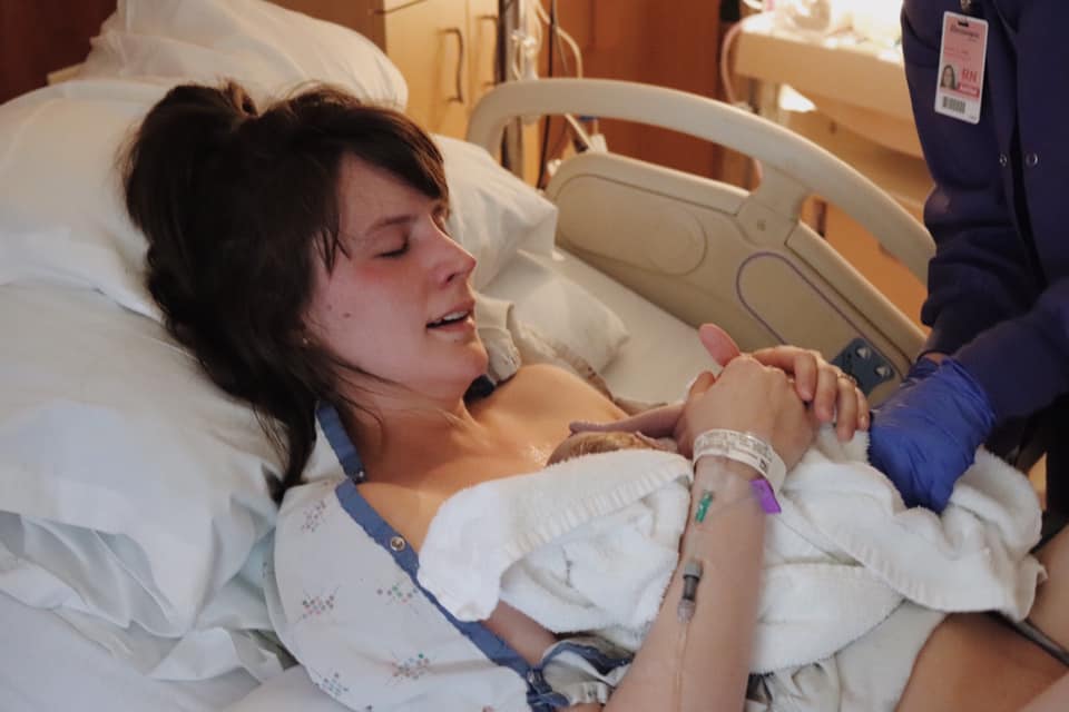 They called the nurse in and I stood up from the birth ball and my water had broken! I got on my hands and knees on the bed and the waves were so intense, I had to push, my body was just doing it! The midwife helping with my birth just wanted to be sure I had progressed all the way to a ten, and so I flipped around really quick for her to check and sure enough, I was a ten. I’m still so amazed I had gone through transformation (Hypnobabies word for transition) without even realizing it!