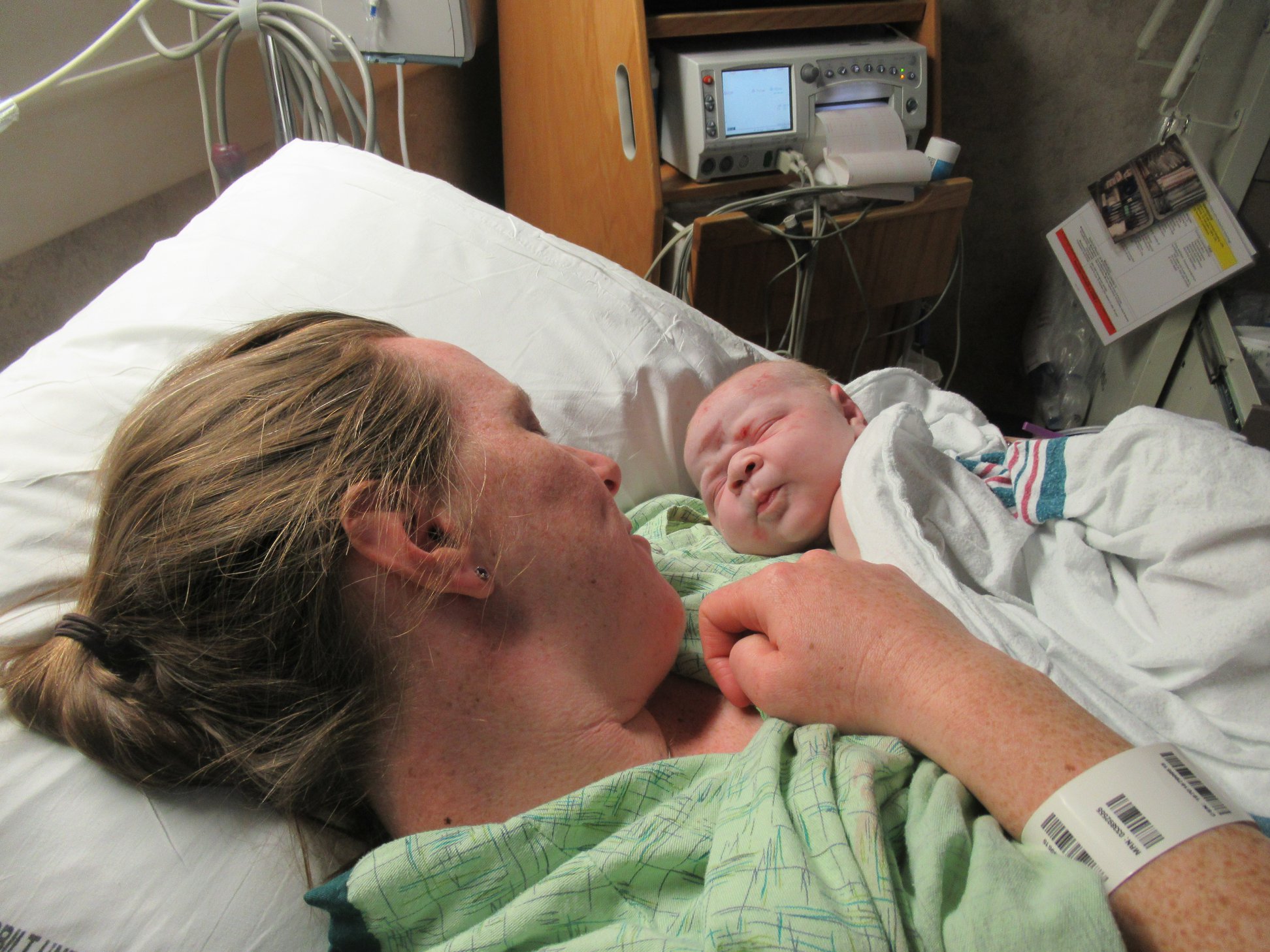 While I had Hypnobabies in my earbuds the whole time, there was no time to change to the pushing track, and at some point, they wanted a cervical check, but my personal check while standing told me the baby crowning. I thought I was going to have that baby standing up. Eventually, I got up on the bed on the next momentarily break between waves and just started pushing, during a wave, between a wave, it didn’t matter: If I was going to do this, I was going to do this NOW. My body was ready. I swear, it was less than 30 seconds of additional pushing and WOOSH, my big fat baby boy was placed on my chest. 9 lbs 15 oz and a 98th percentile head. Birthing hips indeed! All in the triage room which was the size of a tin can.