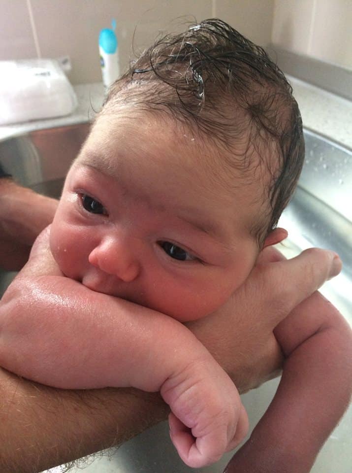 My energy levels were seriously dropping, but still, I was completely comfortable. I likened it to trying to pick up a heavy barbell again and again. It wasn’t painful, but the more I pushed, the more I wore myself out. After several near successes at getting her shoulders out, the doctor suggested I turn over so he could assist. I turned onto my butt and with the next push, the baby was out. I was in the tub pushing for 85 minutes, but it felt like 20 minutes. Layla Isabel was born on February 15 at 7:25 pm weighing 7 lbs 11.5 oz.