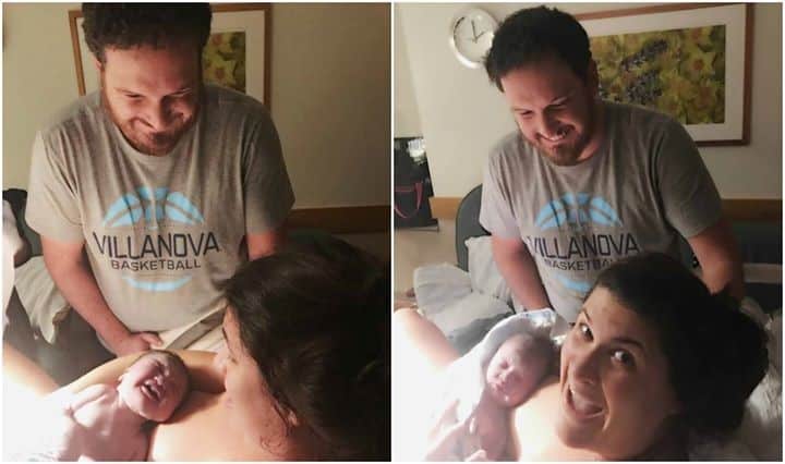 “At 1 am, I decided to get checked and I was at a 10! I started pushing on my knees hanging over the back of the bed and it was going really well.”