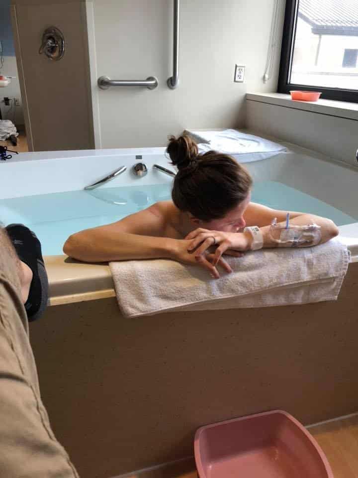 By the time we were eating dinner, the pressure waves were occurring closer together and felt stronger. My husband and I put our daughter to bed that evening, put our hospital bags by the door, and then I was listening to Hypnobabies hypnosis tracks and just really relaxing through the pressure waves. Around midnight, we had my mom come over to stay with our daughter, and we drove to the hospital. I had my earphones in and the birthing day tracks (Hypnobabies hypnosis tracks to keep me comfortable) playing as we went through triage and were checked into a room. I was about 4 cm dilated at this point. My husband was such a great birth partner, asking for a room with a tub and for a nurse who likes working with natural childbirth couples. The nurses there were very helpful and were able to accommodate our requests.