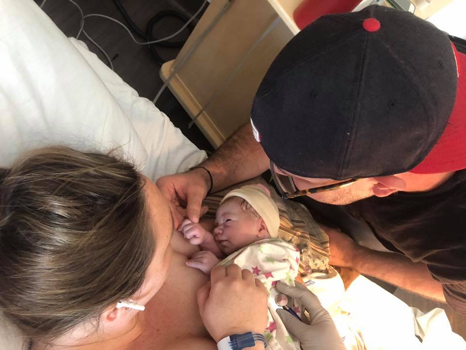 The pushing waves came so quickly that I didn’t have time to change the track to the Pushing Baby Out either on my headphones or on the speaker we brought with us. However, I still found myself very focused on breathing baby out and my husband did awesome reminding me to use low vocalizations as I was pushing. Within 20 mins (that felt like only 5), I could feel baby crowning, and heard one of the nurses say that I was complete. Because I had progressed so quickly, my doctor hadn’t arrived yet, so the laborist at the hospital was the one that was there.