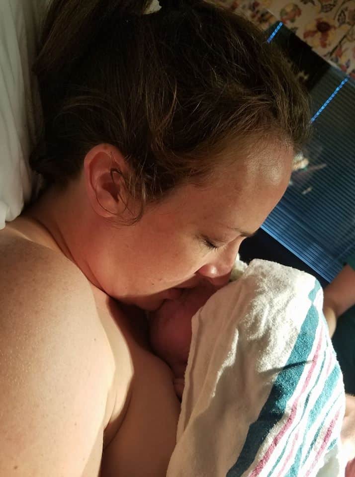 I’d started pushing on hands and knees, but baby’s heart rate didn’t like that position. We tried with me on my side, but that didn’t feel good so we flipped me on my back. I became aware that there was concern over baby’s well-being with his heart rate dropping, I kept hearing that we needed baby out. My midwife informed me that she brought in an OB in case we needed to get baby out fast. Again, my Bubble of Peace remained intact and that just fostered my focus on birthing my baby. I ended up purple pushing, but I was bound and determined that I was going to birth my baby.