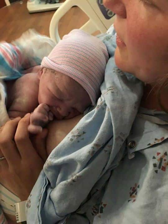 “A nurse quickly came in to check me at that point, and before I could decide if I wanted to know the number, she exclaimed, “Good job, momma! You’re at 9 cm!” Immediately after hearing that news, my body just took over. My Easy First Stage track was still playing aloud as I turned, grabbed the back of the bed, and my body started pushing.”