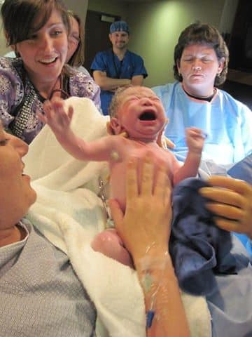 After a few intense waves on the ball, I exclaimed that I was feeling lots of pressure so they got me onto the bed. At this point I wasn’t in a place where I could say “no” so I did but asked to NOT be laid down, luckily they knew I was serious and helped make me comfortable. After 2 1/2 pushes this guy came out!