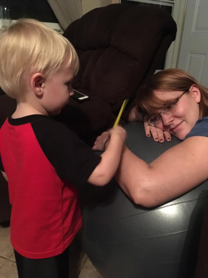 I had been having birthing waves off and on for a few days. Yesterday was chock full of waves but nothing really intense and they didn’t build consistently. They faded by bedtime and I got a great night’s sleep. I woke up feeling energized and even tried to “dance the baby out.” At 7 pm I started getting good strong pressure waves. Since this had happened before I tried a lot of different positions to see if anything made them less intense or fade away. They were 10 minutes apart initially so even though she’s my second baby I figured I had awhile. My favorite moment was when I leaned over the ball (pillows under my knees, swaying my hips – loved this position!). My toddler asked if he could paint on mama (pretend paint!) while I was in the position. I smiled thinking of how I visualize hypno-anesthesia being painted on my cervix and said sure! He stroked my arm with the clean paintbrush and I asked him what color the pretend paint was. You’ll never guess what he said – orange!!! He doesn’t use orange in his art very often so this “coincidence” made my heart so happy that I asked my husband to take a photo.