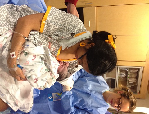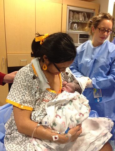 I noticed everyone was panicking and hurrying things up. Suddenly the room was filled with medical staff and one nurse pushed the bed I was leaning on to the birthing room because we were still in the triage room. Everyone was running and I was smiling. It felt so good to feel the breeze on my neck from them running while pushing the bed. I think this was my favorite part, a nice cool ride. They got me to the birthing room and asked me to move to the other bed. I did this without a problem. I was GBS positive and while I was pushing there was a nurse trying to hook up a hep-lock to do antibiotics, which it seemed pointless at this point but I was too focused to argue about it. All this time I’d been pushing only when I felt like it. It was amazing how I didn’t feel any pain, but my body would just push and I knew it was the right time. I was also expecting to vocalize while pushing, but I kept doing the same calm deep breathing I was doing since I began having my early pressure waves.