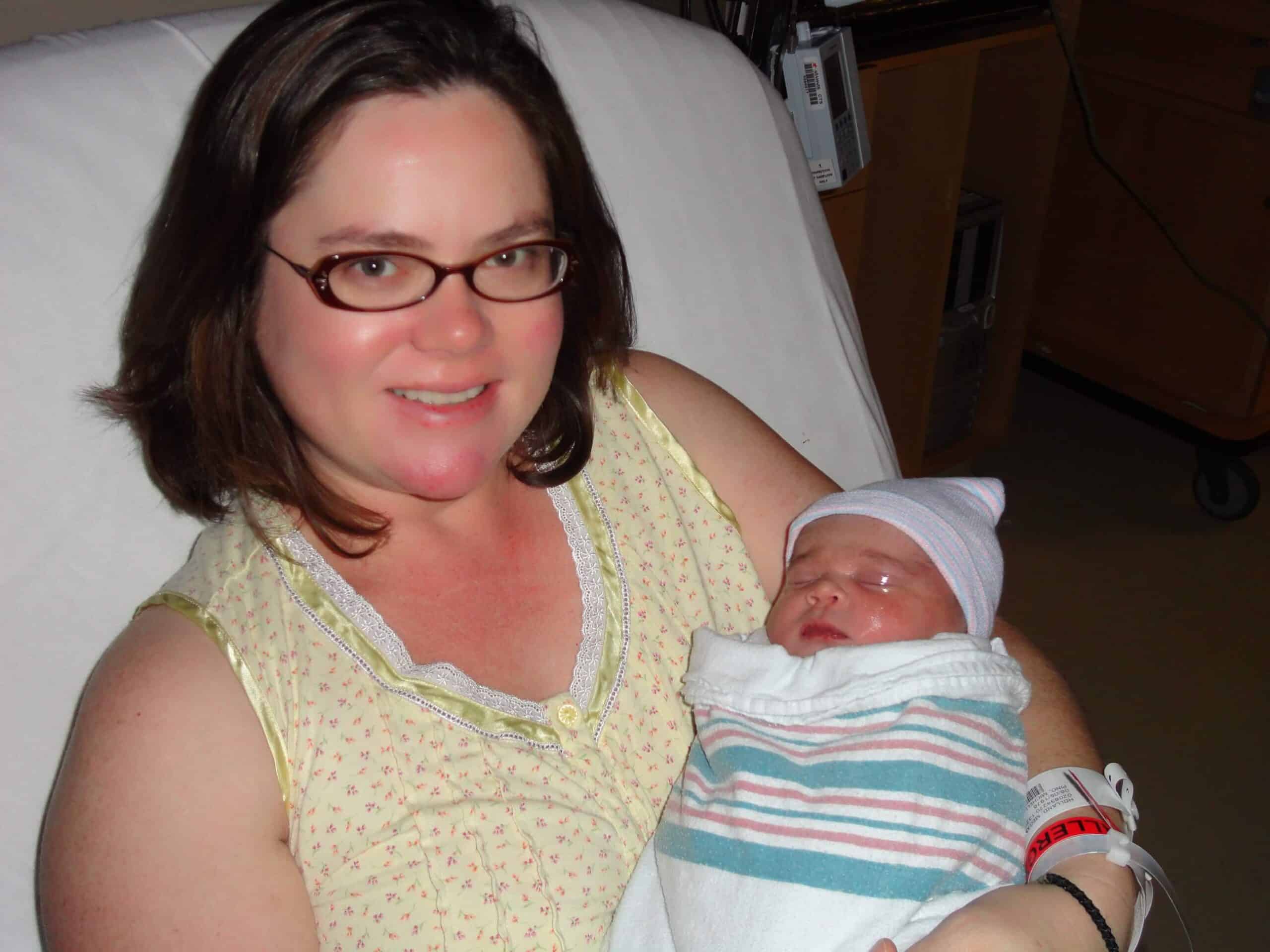 They did have to take Emily to the warmer (in the same room) because even though she cried right away, she wasn’t pinking up like they wanted and she was making these grunting cries. They gave her oxygen and suctioned out a ton of fluid and then she was fine. They laid her back down on my chest and said I should wait a few minutes before nursing her to get her oxygen levels up. The poor thing kept trying to latch onto my non-breast skin! Finally we tried nursing and she caught on after a few tries, unlike my first daughter who struggled with it for a good month (before continuing to nurse for 2 more years!)
