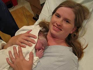I started needing to make noises as I breathed and soon I started having little pushy urges once or twice. I asked the girl helping us (not a RN, but really helpful as a few times she pressed in on my hips during a wave and that felt nice) to have our nurse come and check me again since I was feeling a little pushy. She finally made it back in (I guess a lot of other women showed up around the same time) and checked me and I was at an 8. This was about 6:30. She tried to put in a saline lock, but I wouldn’t hold still for long as I didn’t want to be on the bed during a pressure wave. A PW or two later, my water broke while I was standing. Then the next one I really started pushing and felt like she was going to come out very soon. The nurse really urged me to get on the bed at this time and I did, the next one I pushed out her head and the next the rest of her. It felt so good to get her out. It was very intense and I know I was fairly vocal and cried out when she crowned.