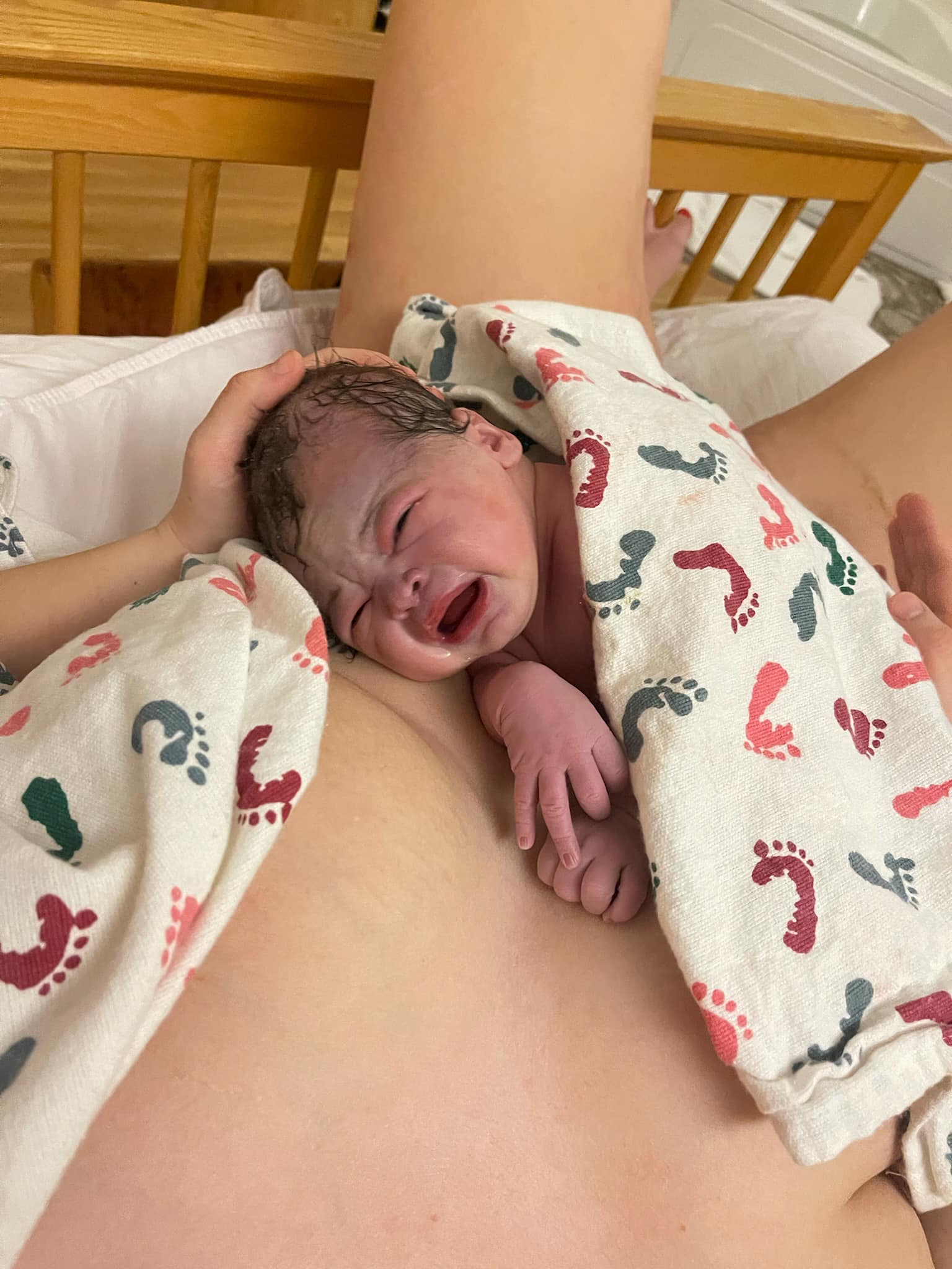 She said I had a small lip in my cervix that needed to dissolve and just relax in the tub until my body is ready! I listened to Easy Comfortable Birth on repeat foe the next hour- I was moaning slightly but kept my breath in check and focused on relaxation. It was about 5:30am now and she came to check me again and said the lip was still there and that the water had slowed down my birthing waves so suggested I try birthing on “land” I got out and moved to the bed and my body instantly started pushing. I told my husband to switch me to Pushing Baby Out track (Hypnobabies track just for pushing) he was a nervous wreck and accidently put “Bubble of Peace” on so I just took my ear pod out and threw it on the ground feeling confident I had the tools to continue birthing without the tracks going. 45 minutes later she came out! She was stuck by the shoulders, and I could tell the midwives were nervous because she wasn’t breathing and had turned blue, but I remained calm and kept breathing and pushing baby out with each wave and breathe.